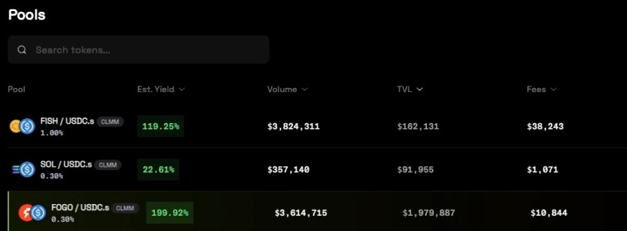 Head to valiant.trade and click on Pools. You'll see various trading pairs with their estimated yearly yields. For this example, we'll use the FOGO/USDC pool.
