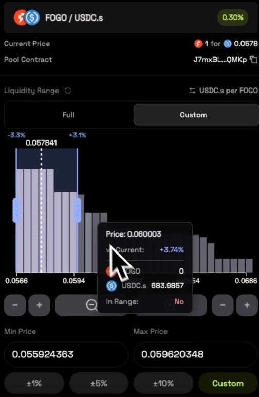 If the price stays above your range, you earn no fees but keep your USDC. If it drops below your entire range, you'll have converted to FOGO but won't earn fees until the price moves back into range.