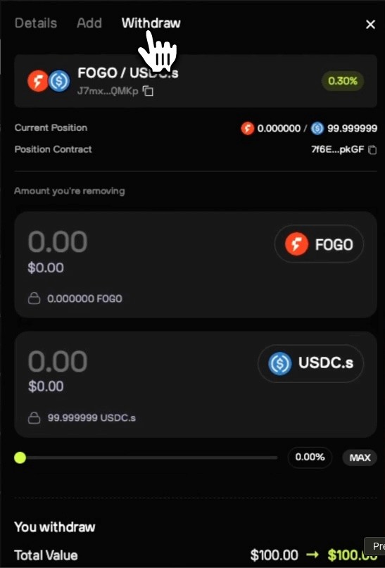 The key indicator is the deposit ratio. If it shows 100% USDC and 0% FOGO, that means you're depositing only USDC, which will convert to FOGO as the price drops.