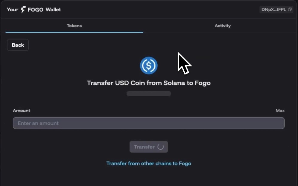 To transfer in: If you have USDC on Solana, you can bridge it over to Fogo right from the Portfolio dashboard. You can also transfer from other blockchains.