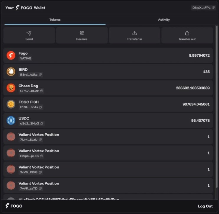 Once connected, your dashboard displays all your token holdings laid out clearly. At this stage, as we’re early to Fogo, there is no price feed, but there will likely be one in the future.