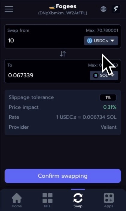 Nightly has a built-in swap feature. Select the token you want to swap from, choose what you want to swap to, and confirm. Be aware that swaps through the app include an additional fee.