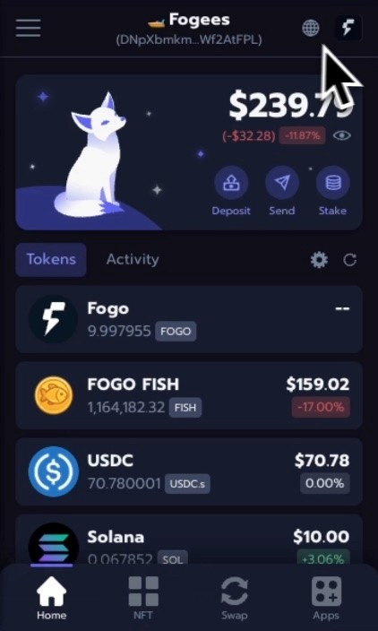 Below your balance, you'll see your tokens (Fogo, USDC, etc.) and an NFT panel for when NFTs launch on Fogo.