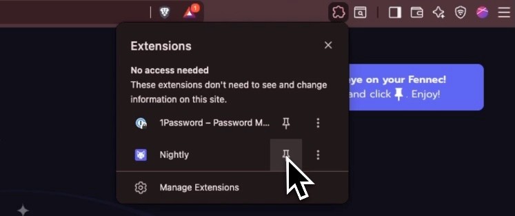 After setup, pin it to your browser by clicking the jigsaw/puzzle piece icon in your browser toolbar and pin the Nightly extension.